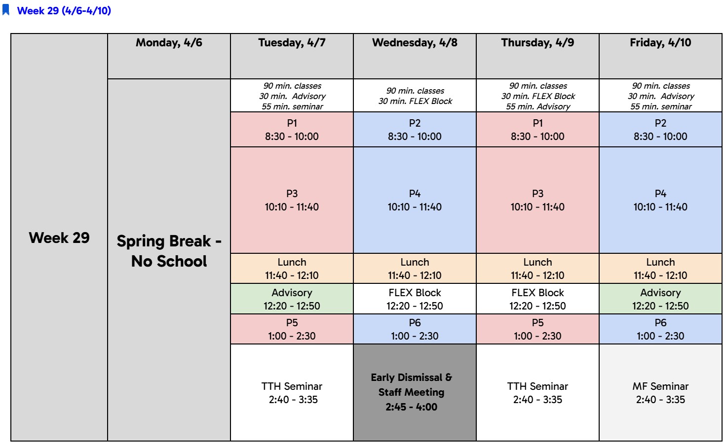 Community Learning Day: The fourth (and final) Community Learning Day (CLD) of the year will take place on Friday, April 24. As a reminder, ALL students must complete the CLD attendance quiz on Canvas.