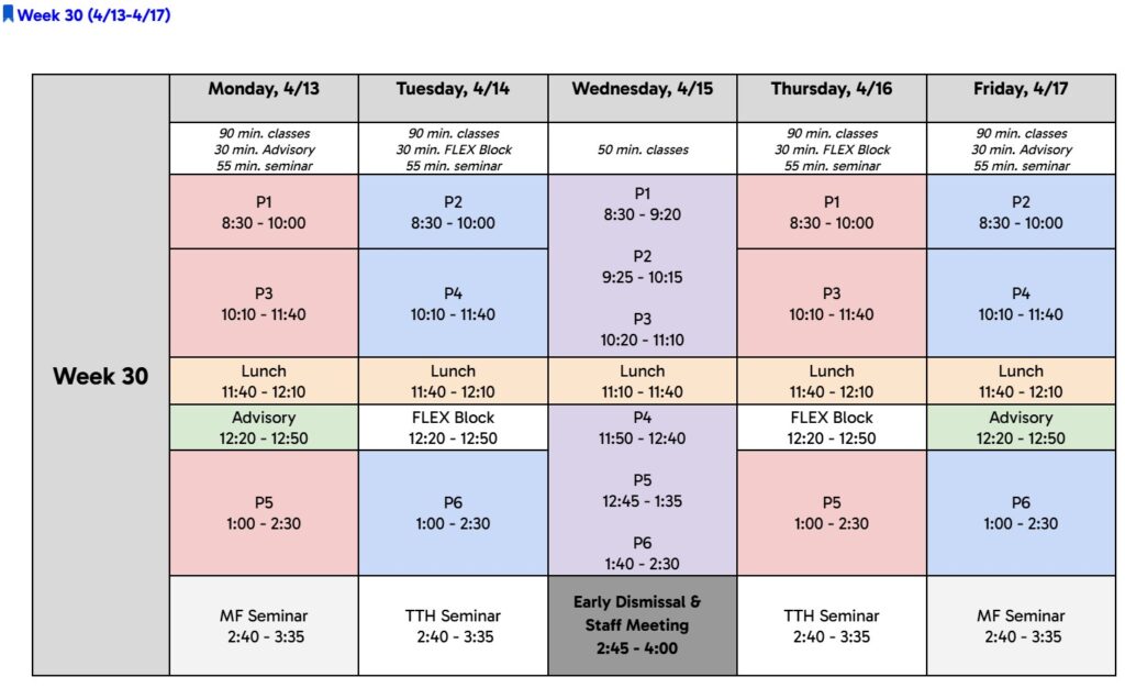 Community Learning Day: The fourth (and final) Community Learning Day (CLD) of the year will take place on Friday, April 24. See here for a list of descriptions. As a reminder, ALL students must complete the CLD attendance quiz on Canvas.