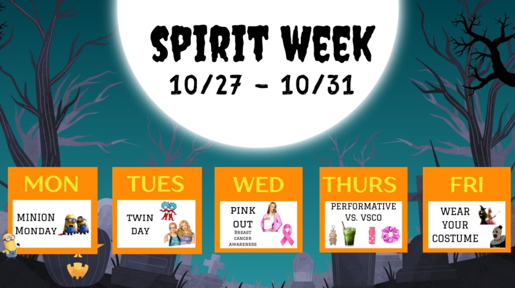 We are excited for Halloween and our upcoming spirit week (see below), and we encourage students to wear costumes if they would like. As a reminder, Halloween costumes must be school and dress code appropriate, face coverings cannot be worn, and no weapons or items that look like weapons are allowed.