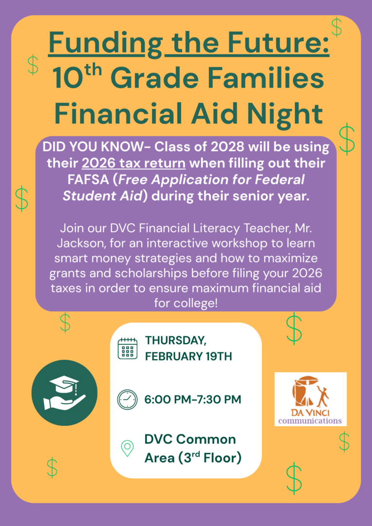 The 10th Grade Financial Info Night has been moved from Thursday, January 29th to February 19th at 6:00pm.  This event will be located in the DVC Common Area.  Please mark this in your calendars, and contact cjackson@davincischools.org for more info.