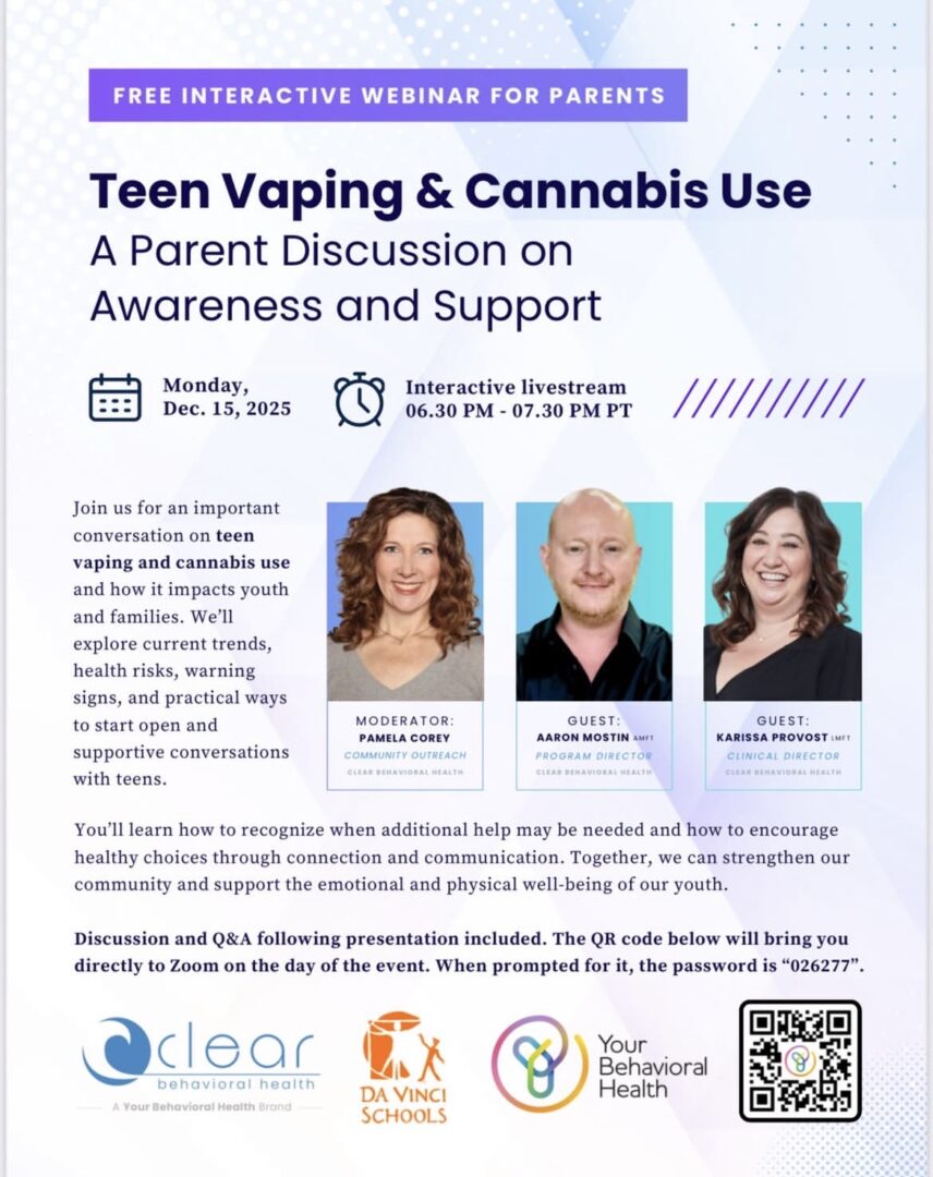 Join Da Vinci Schools and our health partners for an important conversation on teen vaping and cannabis use, and how it impacts youth and families, as well as what you can do to start open and supportive conversations with teens. For info, please see the flyer here.