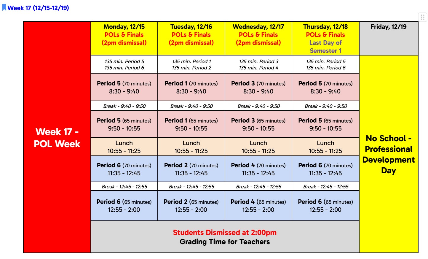 It’s here – the final week of Semester 1! We have been so impressed by our students as they started their POLs last week, and we know that there are more strong presentations to come this week. POLs and Finals continue this week, with early dismissal from Mon-Thurs at 2:00pm. A reminder that Friday, 12/19, is a Professional Development Day (no students).